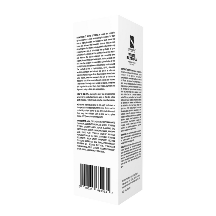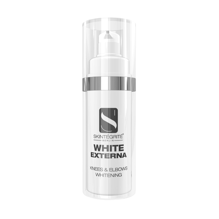 SKINTÉGRITÉ® WHITE EXTERNA is a specialized daily-use brightening cream formulated to treat and prevent hyperpigmentation in tough, friction-prone areas like the knees and elbows. It works by reducing melanin production, helping to visibly fade darkened skin caused by friction, sun exposure, or hormonal changes.